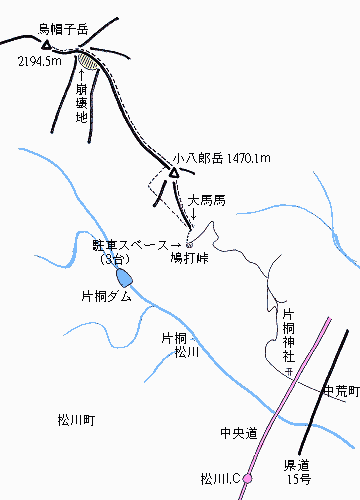 登山口へは県道の15号線(飯島飯田線)の上片桐、中荒町から片桐神社に向かって西に入る。すぐ林道になるが舗装されている。いくつかに道は分かれているが、一番交通量が多いと思われる道を行けばよい。鳩打峠は行き止まりになっていて、駐車スペースが数台分ある。登山口には手製の杖が何本も置かれている。地元の方が用意してくれた物だ。小八郎へは途中からザレた急坂になるので、ありがたい限り。幾重にも折れた登山道をしばらく登ると、大馬馬という馬をつないでおいた見通しの良い場所に出る。小八郎へはここから尾根についている急な道に進む。針葉樹林だった辺りはミズナラの多い雑木林に変わる。時期にもよるがサラサドウダンなどが見事に咲いていたりもする。ひとしきり登れば頂上に近いが、この辺りは若干注意しよう。右側に崩壊壁が広がっているので、むやみにのぞきに行かない方が身のためと言うもの。頂上は切り開かれていて見晴らしが良い。伊那谷と南アルプスの眺めが素晴らしい。片桐小八郎さんもここから我が地を見下ろしていたのだろう。